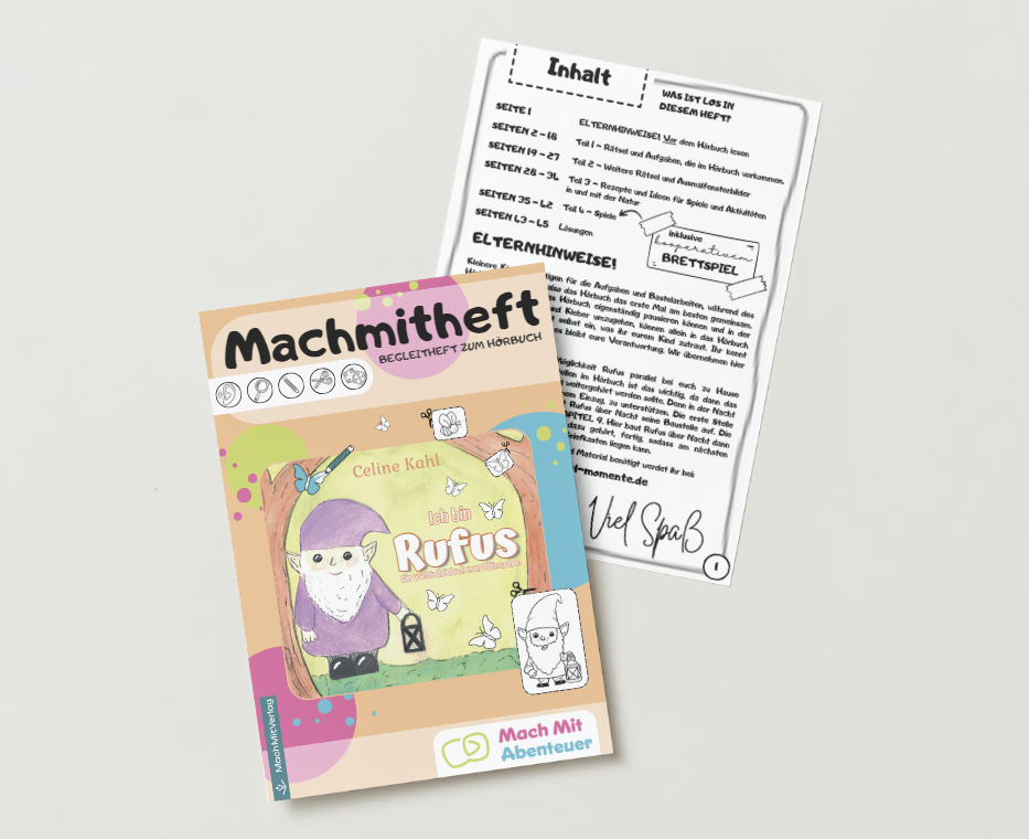 In dem dazugehörigen MachMitHeft werden gemeinsam wichtelige Rätsel gelöst, Aufgaben bewältigt, Bilder gemalt und vieles mehr. Hier gibt es auch nach dem Ende des Hörbuches noch weitere Rätsel, Spiele zur Beschäftigung allein oder gemeinsam mit der Familie und Ideen für Aktivitäten draußen in der Natur. Alles rund um das Thema Wichtel.